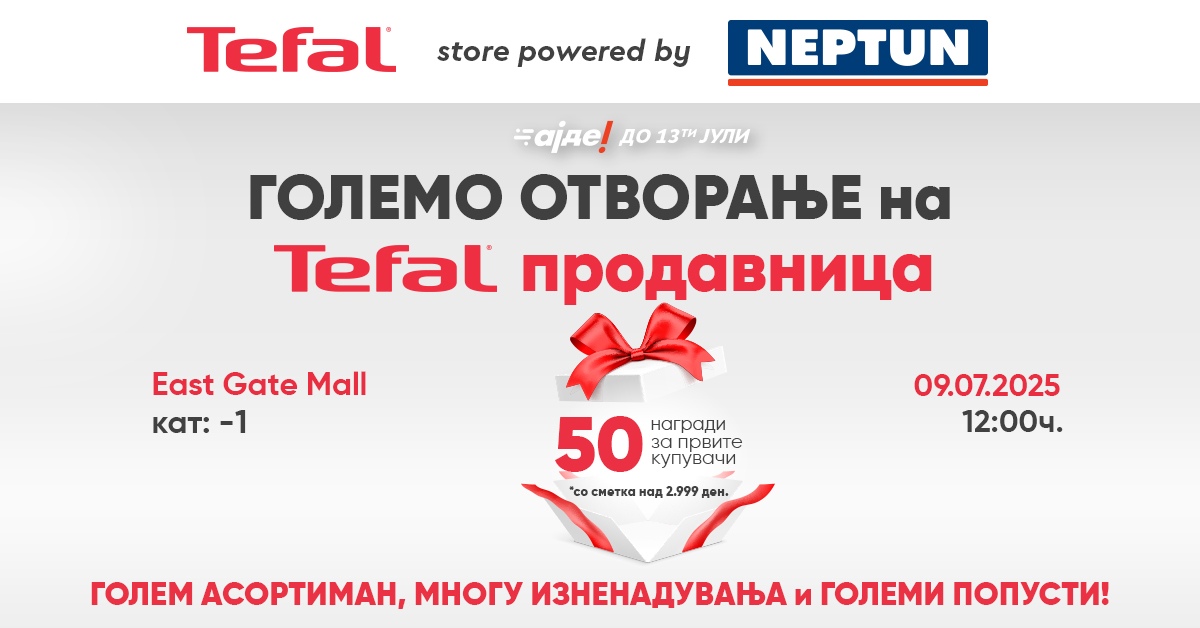 Големото отворање на Tefal Store powered by Нептун во East Gate Mall (кат -1) ќе биде на 09.07.2025 (среда) во 12:00 часот. Првите 50 купувачи на денот на отворањето со сметка над 2.999 денари добиваат подарок.