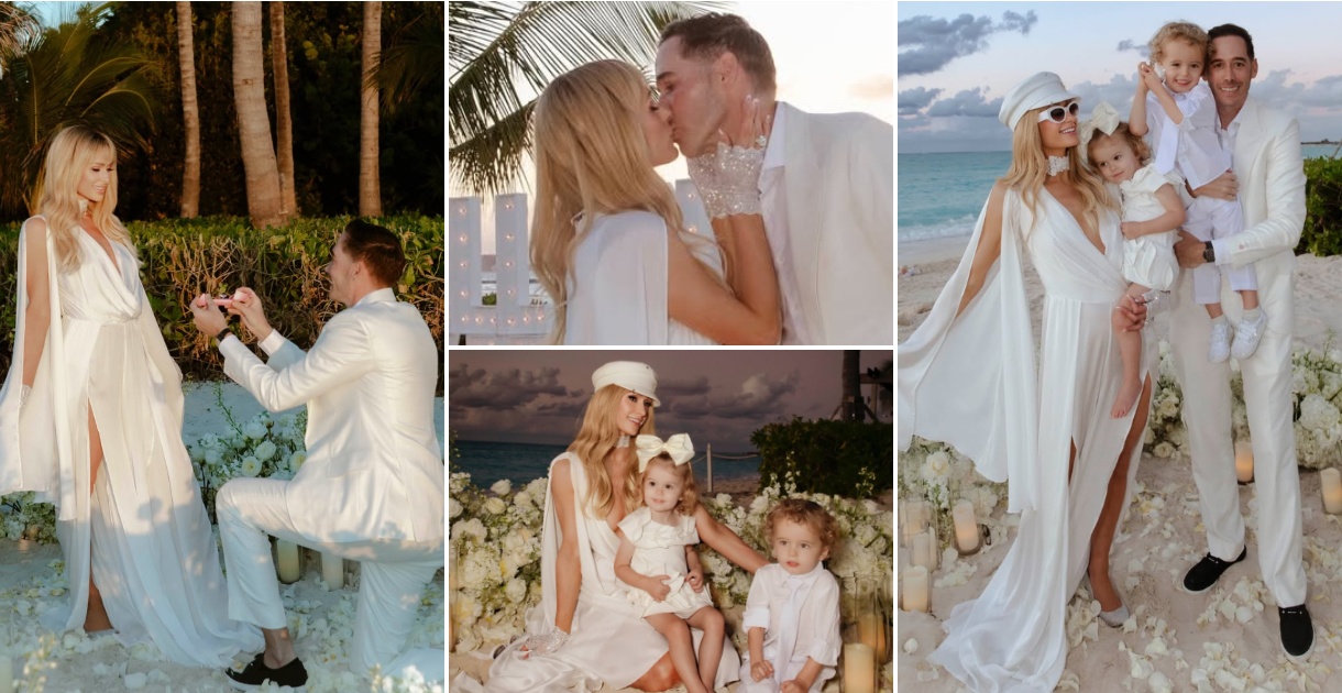 За свеченоста, Парис носеше бел фустан со впечатливи сребрени ракавици, додека Картер се одлучи за елегантен бел костум. На видеата се гледа како нивниот син помага при ставањето на прстенот.