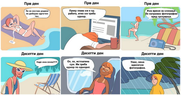 Илустрациите на Екатерина Гапанович ги прикажуваат маките на туристите, односно ситуациите во кои многумина ќе се пронајдат.