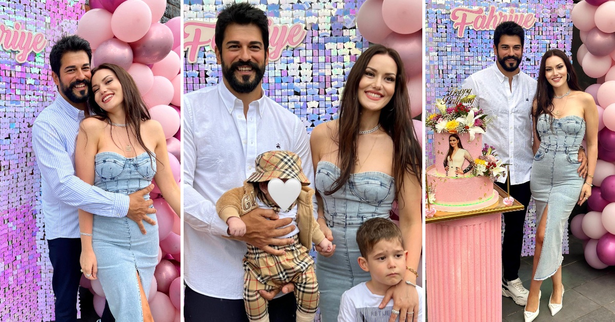 Фахрие позираше со сопругот Бурак Озчивит и нивните две деца покрај балони и позадина во барби стил.