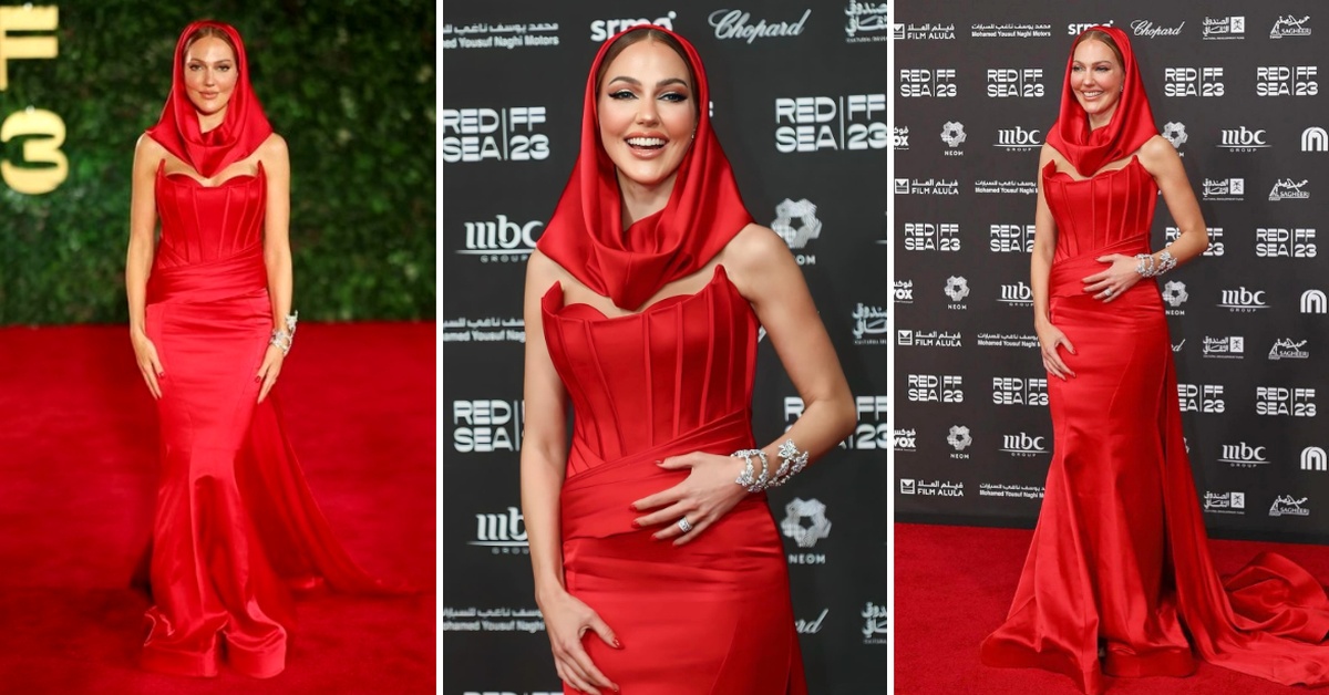 На манифестацијата во Џеда, Саудиска Арабија, турската актерка привлекуваше погледи во црвена креација од брендот Nour Fathallah.