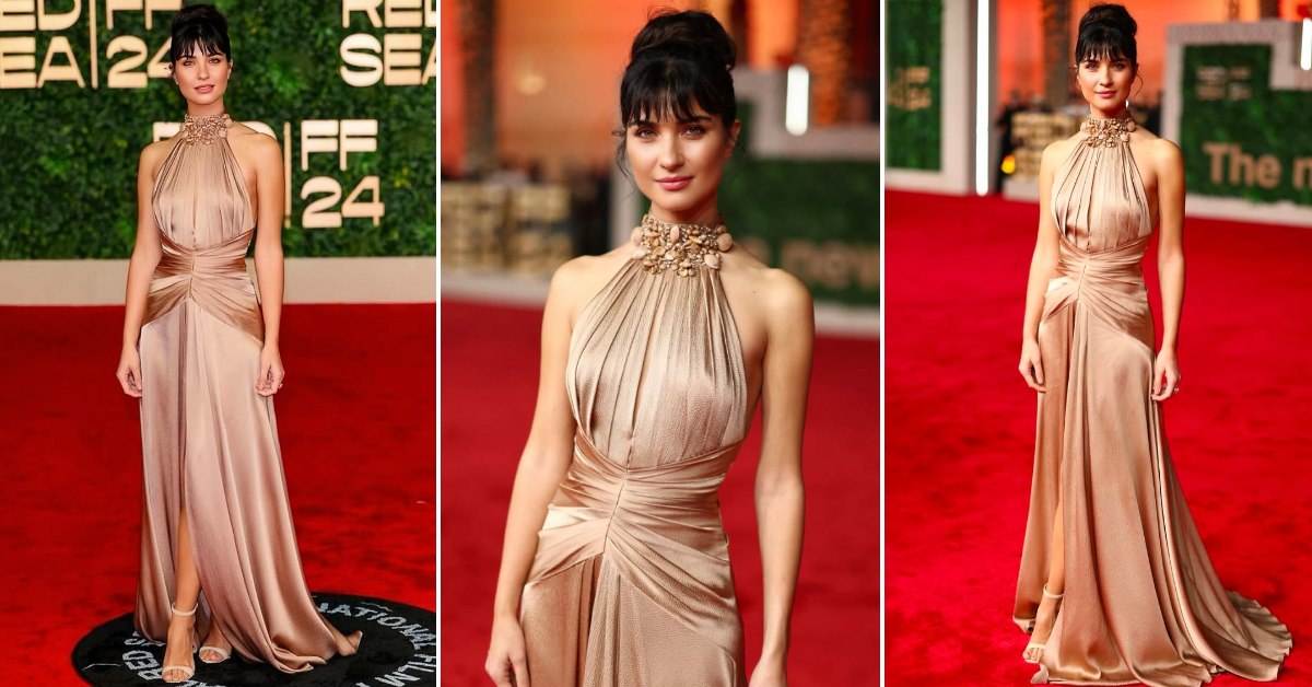 42-годишната турска актерка, позната по улогите во „Аси“ и „Ќерката на амбасадорот“, остави силен впечаток во креација во шампањ нијанса. Тоалетата со школки извезени во делот на вратот е од пролетната колекција за 2025 година на Зухаир Мурад.