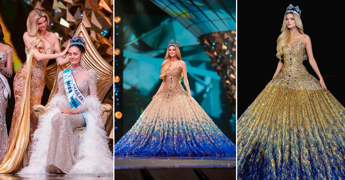 На последното свое појавување на Мис на светот, убавата Чехинка носеше раскошна креација достојна за кралици. Рачно изработениот фустан кој беспрекорно преминува од кралско сина во златна боја е дело на филипинскиот дизајнер Лео Алмодал.
