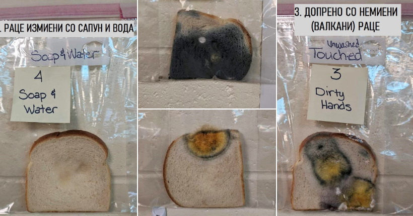 Минатиот месец, кога започна сезоната на грип, направивме проект на час. Зедовме пресен леб и го допиравме. Едно парче беше недопрено. Едно беше допрено со немиени раце. Едно беше допрено со средство за дезинфекција на раце. Едно беше допрено со раце измиени со сапун и вода. Потоа, одлучивме едно парче да истриеме на сите лаптопи во училницата.