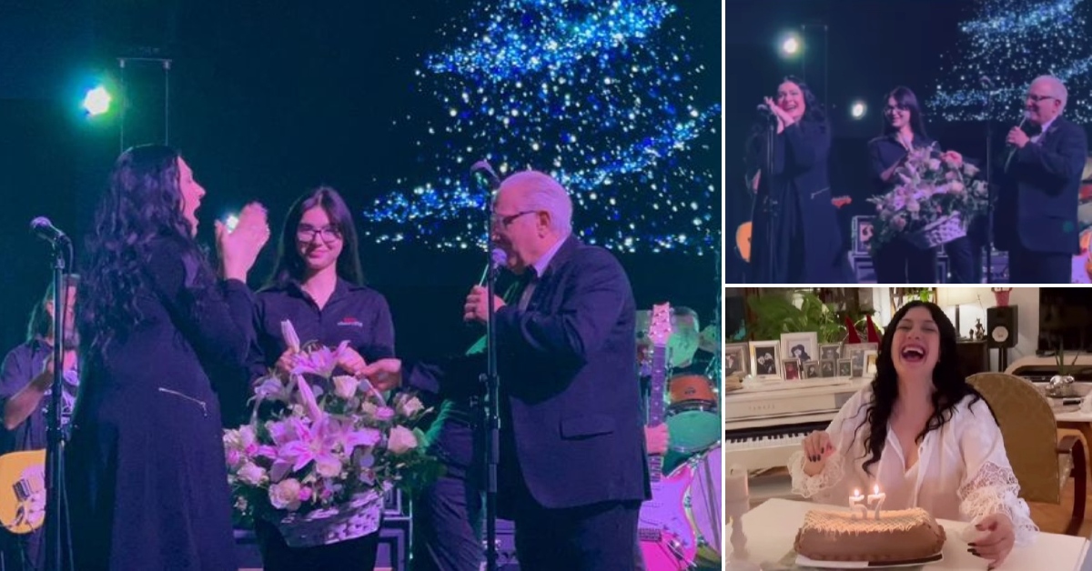 „Уф, каков роденден“: Калиопи изненадена со кошница цвеќиња на концертот на Жељко Самарџиќ за 57-миот роденден