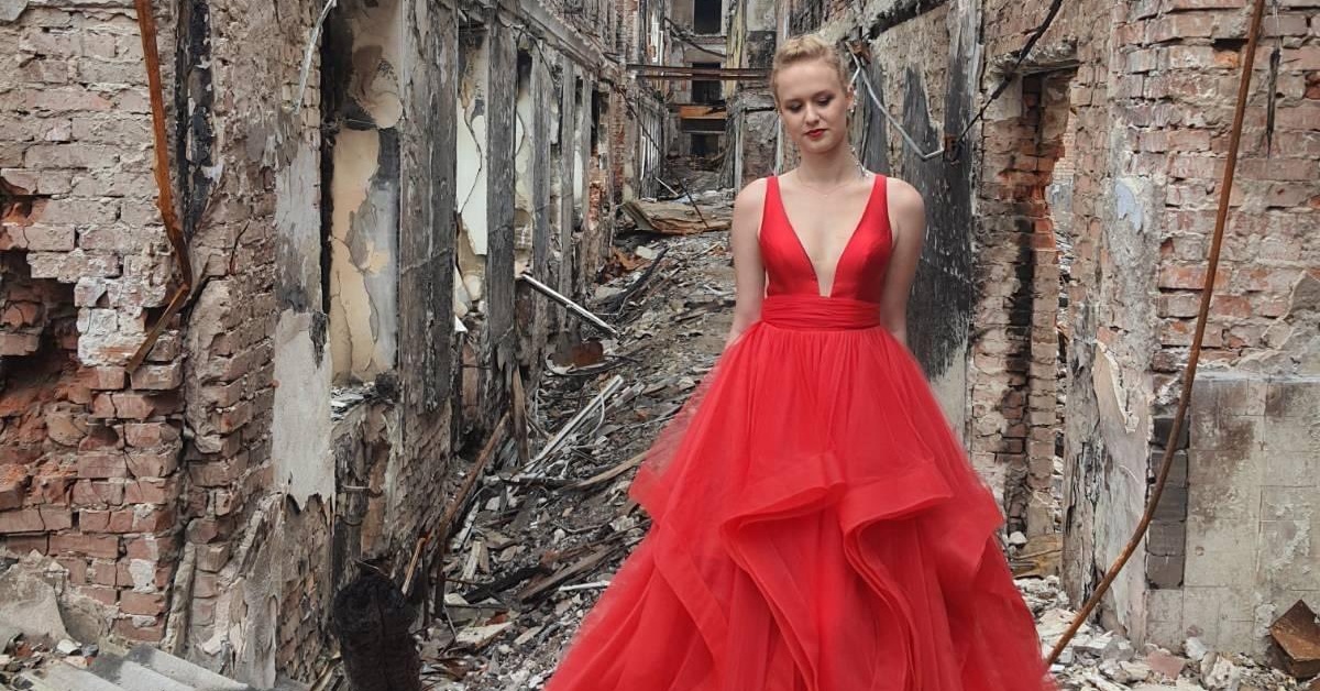 Девојката од Харков го облече прекрасниот фустан во кој сонуваше да ја прослави својата матура и отиде да го посети училиштето каде требаше да заврши средно образование. Таа позираше до урнатините кои се резултат на воениот конфликт со Русија.
