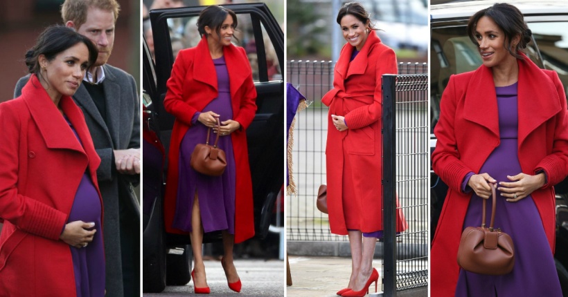 За исполнувањето на нејзината прва кралска должност со принцот Хари во новата година, 37-годишната поранешна актерка избра црвено палто од Sentaler кое го носеше над виолетов фустан од Babaton. Својот стајлинг таа го заокружи со црвени салонки.