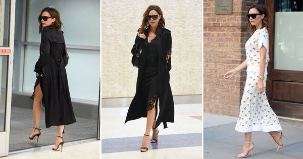Стајлингот во црна боја вклучува слип фустан со цветни детали од пред-есенската колекција на Бекам и долг мантил. И очилата и чантата го носат потписот на Викторија.