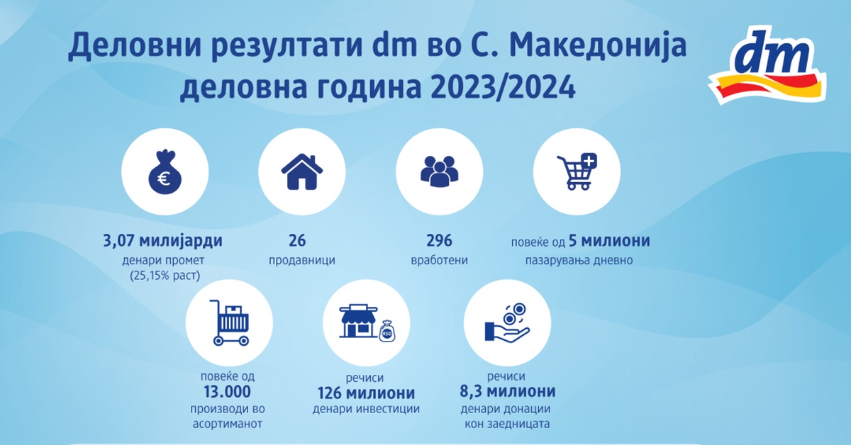 Компанијата dm drogerie markt постигна извонредни деловни резултати во деловната 2023/24 година. Со остварен промет од 3,07 милијарди денари, односно раст од 25,15 отсто, инвестиции во износ од речиси 126 милиони денари во својата продажна мрежа, како и раст на фреквенцијата на пазарување од окoлу 16 отсто, најголемиот дрогериски синџир постигна напредок во сите клучни области и ја зајакна својата позиција на македонскиот пазар.