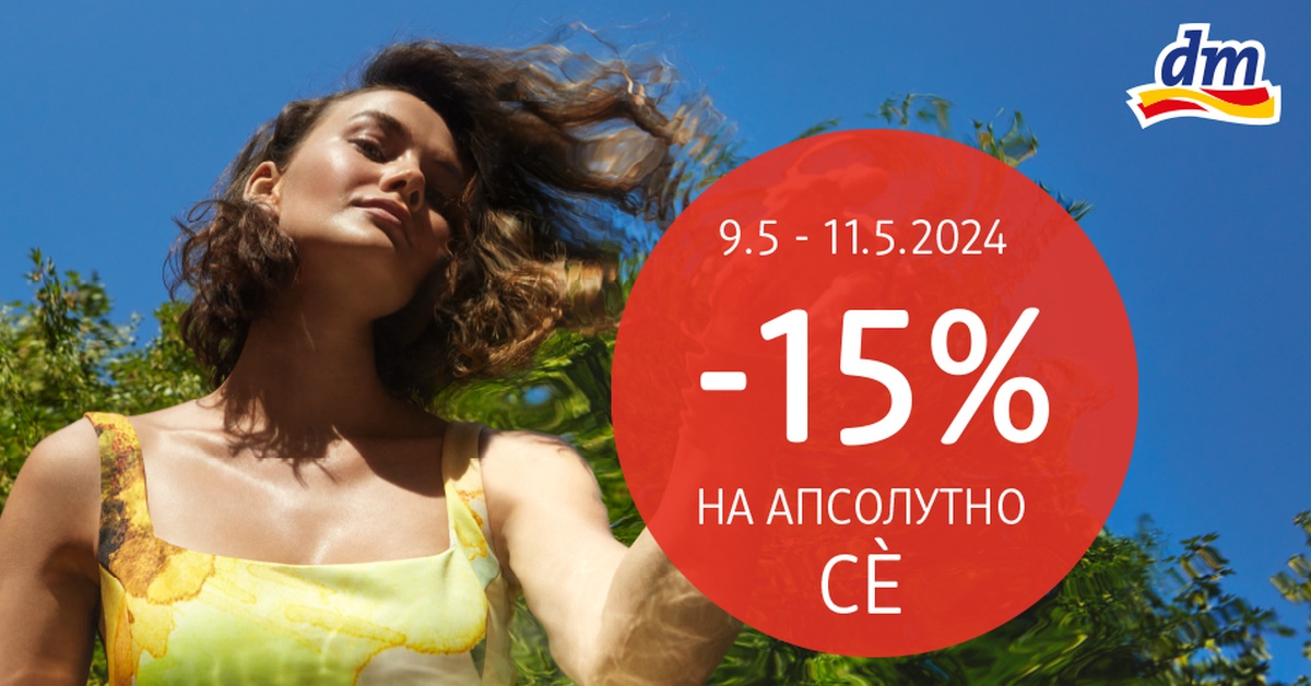 По тој повод, dm на своите купувачи им нуди –15% ПОПУСТ НА АПСОЛУТНО СЀ! Овие попусти ќе траат од 9-ти до 11-ти мај.