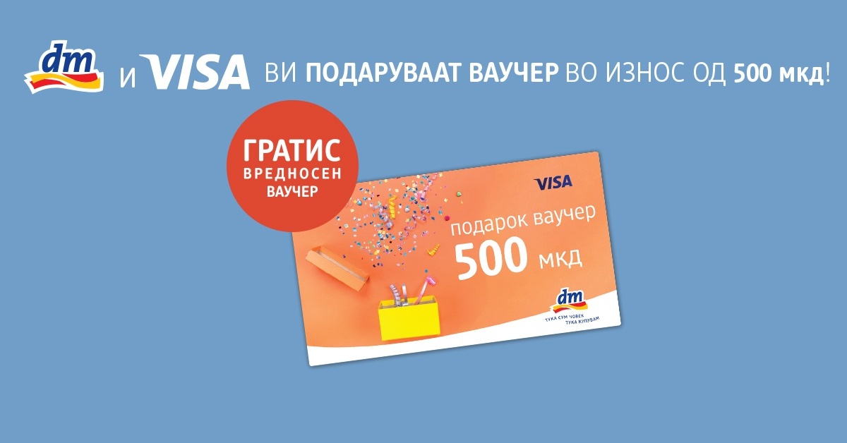 Почнувајќи од 10.8.2020, за секоја сметка направена во дрогериите на dm, чиј износ надминува 2.000 денари, а е платена со КОЈА БИЛО VISA КАРТИЧКА, добивате вредносен ваучер од 500 денари.