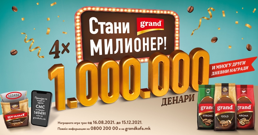 Започнувајќи од 16.08 па сè до 15.12.2021, секој кој ќе купи 200г. пакување од Grand Gold, Arome или Strong во внатрешноста на пакувањето може да пронајде код со кој може да учествува во наградната игра „Стани Гранд милионер“. Секој што учествува во наградната игра ќе добие можност да освои вредни дневни награди секој ден, а секој месец најсреќниот ќе добие главна награда од 1.000.000 денари! Звучи забавно, нели? Но, како да учествувате во наградната игра?