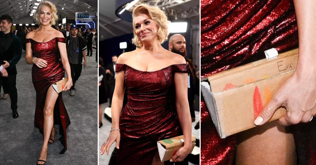 49-годишната актерка, која беше и водителка на Евровизија 2023, носеше црвена креација од Тони Вард, која ја надополни со специјален моден додаток – чанта од картон направена од нејзината 9-годишна ќерка.