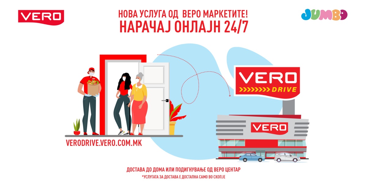 Широката палета на производи во Веро маркетите во Скопје отсега е достапна за онлајн-нарачки преку услугата Vero Drive. Со посета на интернет-страницата https://verodrive.vero.com.mk потрошувачите имаат можност во било кое време да ги нарачаат потребните производи, бидејќи опцијата е достапна 24 часа и седум дена во неделата. Заинтересираните купувачи можат да одберат дали сакаат избраните производи да им бидат доставени до домот или самите да ги подигнат од Веро центар.