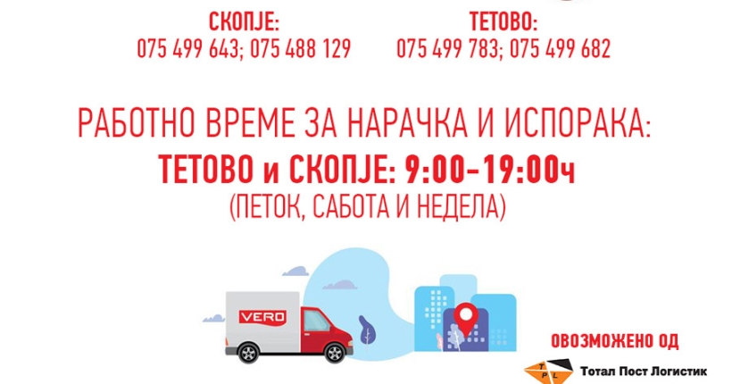 Веро викендов врши достава на производи до домовите на потрошувачите во Скопје и Тетово додека трае целосната забрана за движење на граѓаните која завршува во понеделник наутро. Нарачките на производите се прават телефонски, при што работното време за нарачки и испорака е од 9 до 19 часот (во петок, сабота и недела).