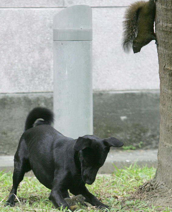 Кучето се обидува да си ја задоволи љубопитноста за малото вервериче, кое најверојатно паднало од дрвото.