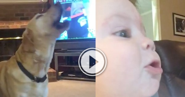 Во видеото кое Лери Вудс го сподели на YouTube, двата лабрадори се натпреваруваат кој ќе завива погласно, па малото бебенце не сакаше да го пропушти натпреварот и реши да се обиде да учествува.