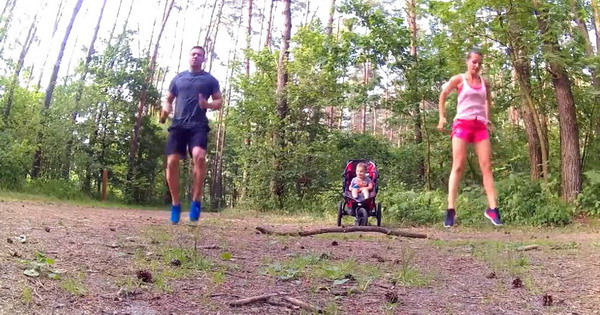 Родители кои истовремено вежбаат и го шетаат и забавуваат своето дете ќе ве мотивираат да бидете поактивни без да си барате изговори. Флексибилното дуо изведува вежби во парк додека нивното синче ги набљудува од количката и се забавува со нивните потези.