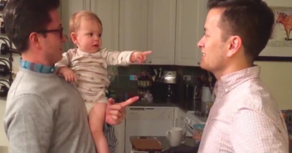 Во видеото, кое досега има повеќе од 6 милиони прегледувања на Facebook, браќата си го подаваат детето кое постојано посочува кон другиот, велејќи „тата“.