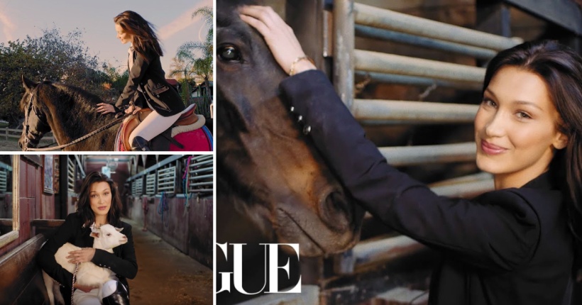 Бела Хадид одговори на 73 прашања за „Вог“. 22-годишниот модел ја води камерата низ штала, каде гали и храни коњчиња и коза, а потоа и јава коњ.