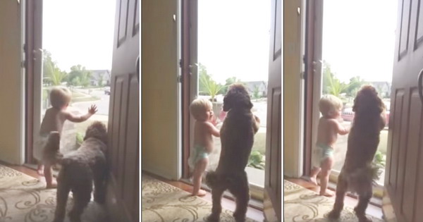 Дете и кученце на ист начин ја покажуваат радоста кога тато се враќа дома. Слаткото дуо се возбудува само што ќе го здогледа автомобилот на улицата. Погледнете ја бесценетата реакција: