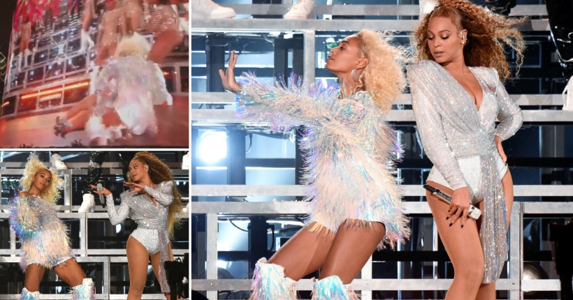 На вториот викенд на популарниот фестивал, 36-годишната пејачка настапи со сестра си Соланж, а во моментот кога се обиде да ја прегрне, двете се струполија на сцената.