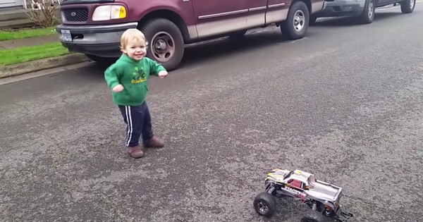 Погледнете танц на дете кое се обидува да го следи ритамот на движење на својата играчка-камион.