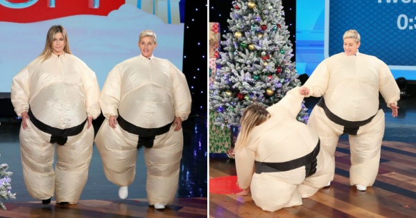 Џенифер Анистон е најновата гостинка во шоуто на Елен Деџенерис. 47-годишната актерка и 58-годишната водителка ја забавуваа публиката преправени во сумо борачи.