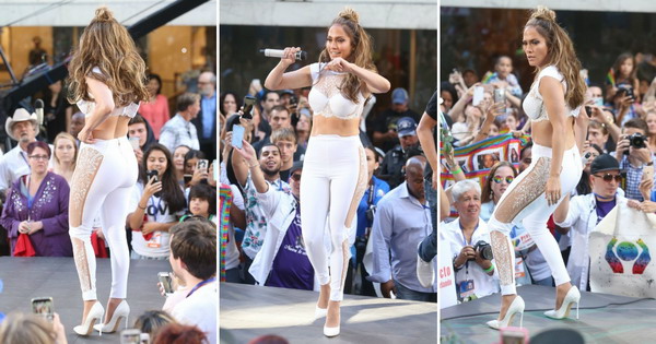 За изведбата, Лопез ги истакна облините во сексапилна бела комбинација.