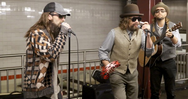 Адам Левин и Џејмс Валентајн од Maroon 5 и Џими Фелон свиреа и пееја во метро во Њујорк маскирани како улични музичари.