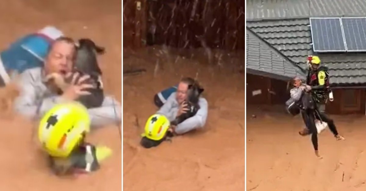 Ова е моментот кога спасувачите успеаја да одведат жена и нејзиното куче на безбедно место откако нивниот дом бил поплавен. Во видеото, маж врзува опрема за спасување околу жената, која подоцна е подигната со хеликоптер од итните служби.
