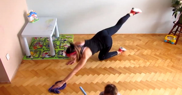 Во видеото, мајка со тонирано тело вежба додека чисти, пегла и собира алишта. Сепак, не може да се потцени и придонесот на нејзиното синче за чистотата на домот.