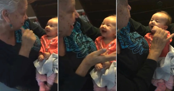Во него, бабата Памела ја учи својата глува внука Арија знаковен јазик. Реакцијата на малото девојче е преслатка. Иако има само 9 недели, Арија се обидува да ги повтори движењата на баба си. Погледнете: