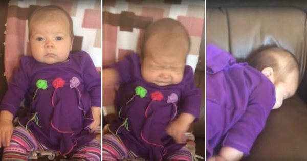 Бебенце, кое паѓа на креветот откако ќе кивне, ќе ве насмее. На почетокот од видеото, малото девојче седи потпрено на каучот, но кога ќе кивне, не може да си го контролира телото и се струполува на креветот.