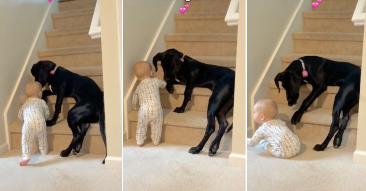 Видео од куче кое пази и штити мало бебе растопува срца на интернет. Кучето Лиса влегува во улога на „дадилка“ и не му дозволува на Елиот да се качи по стрмните скали.