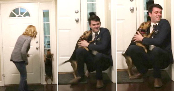Кучето Бејли искрено се радува за враќањето на својот сопственик дома, по двегодишна црковна мисија во Русија.