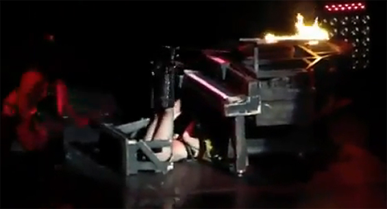 Лејди Гага е позната по своите динамични и бесни изведби на сцена. Но, вчера качувањето врз запалениот клавир не ѝ појде од рака, па Гага се најде на подот со нозете кренати во воздух.