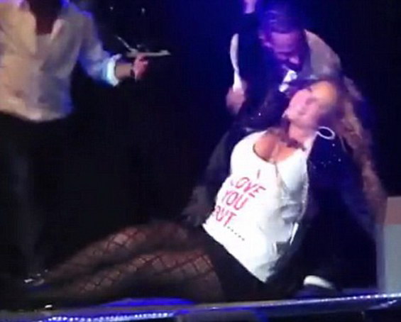 Мараја Кери, за која се претпоставува дека е бремена, падна на сцената за време на настап во живо во Сингапур. Машките танчери кои настапуваа со неа веднаш ѝ помогнаа да се врати на нозе.