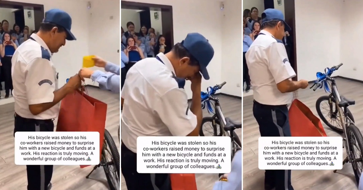 His bicycle was stolen so his co-workers raised money to surprise him with a new bike and funds at a work. His reaction is truly moving. A wonderful group of people.️