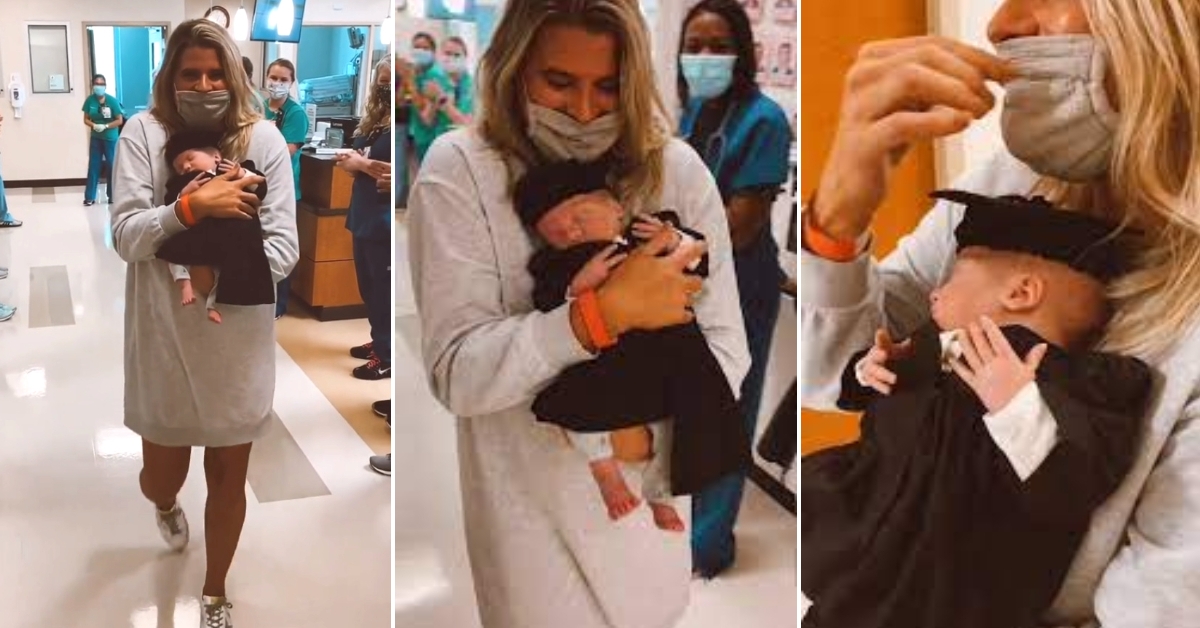 Во него, мајката Кели го носи малиот Кит облечен како мини матурант додека медицинските лица од одделот за неонатална интензивна нега му аплаудираат.
