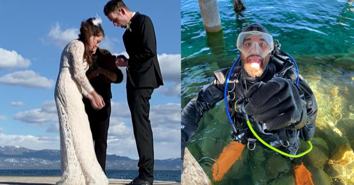 Младите партнери одлучиле нивната венчавка да се одржи покрај езерото Тахо. За време на разменувањето на бурмите на интимната церемонија, младоженецот несакајќи го испушти прстенот кој заврши во студените води.