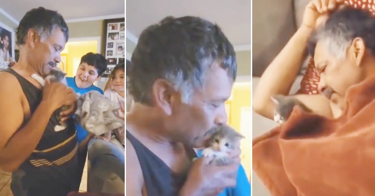 This father recently lost his cat that he loved very much and was very attached to. His family decided to gift him a kitten and his reaction is adorable. Wait till the end, video gets better and better. (:ahlmah142) pic.twitter.com/UMObJIxLyr