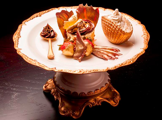 Луксузниот десерт е приготвен од чоколадо и ванила со врвен квалитет, а е декорирано со златна прашина и златна фолија од 23-каратно злато.