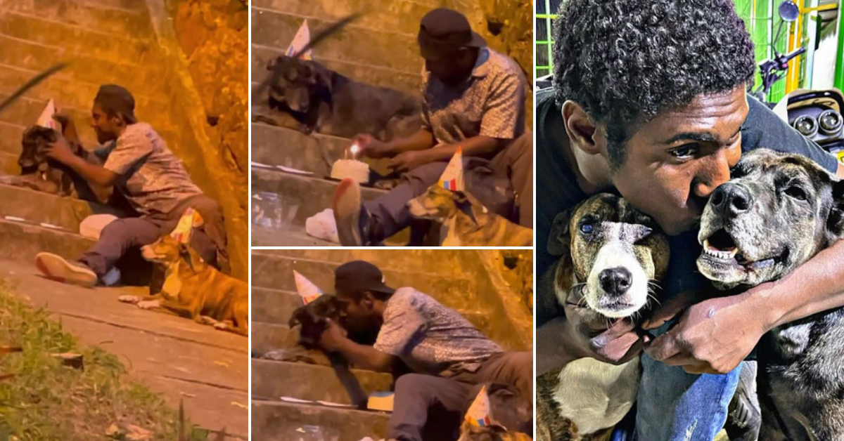 Бездомен маж стана вирален хит на социјалните мрежи откако беше снимен како му прави мини роденденска забава на неговото куче на скали во парк во Колумбија.