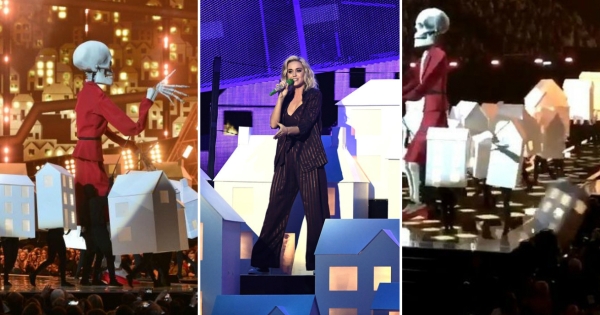 Настапот вклучуваше два џиновски скелети и танчари скриени под куќарки, кои ја претставуваат Белата куќа. За време на изведбата, еден од танчарите падна од сцената. Погледнете го видеото во кое тој ќе ја згреши насоката и ќе падне: