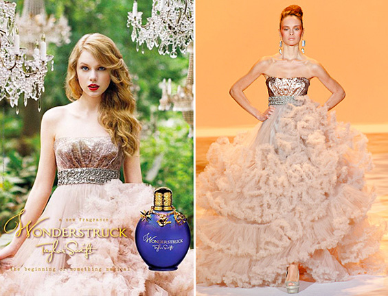 Лево: Тејлор Свифт во рекламата за Wonderstruck/ Десно: Модел на ревијата на Кристијан Сириано