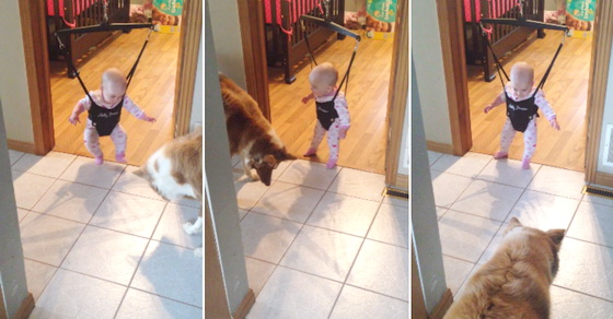 Иако изгледа како Дакота да ја учи малата Алексис да го користи џамперот, всушност неодоливото куче си игра со сенката на насмеаното бебенце.