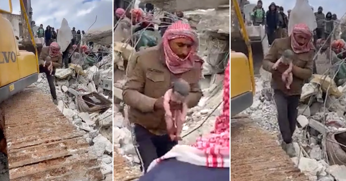 Маж спаси новородено бебенце во Сирија минути откако мајката се породи под рушевините на зграда.