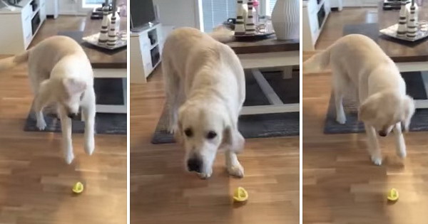 Во видеото е прикажано куче од расата златен ретривер кое неконтролирано скока откако ќе лизне парче лимон.