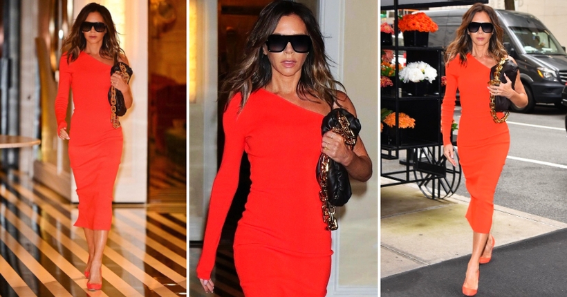 Славната дизајнерка чекореше самоуверено пред хотелот во кој престојува во Менхетен во асиметричен фустан од нејзината нова линија Victoria Beckham Body.